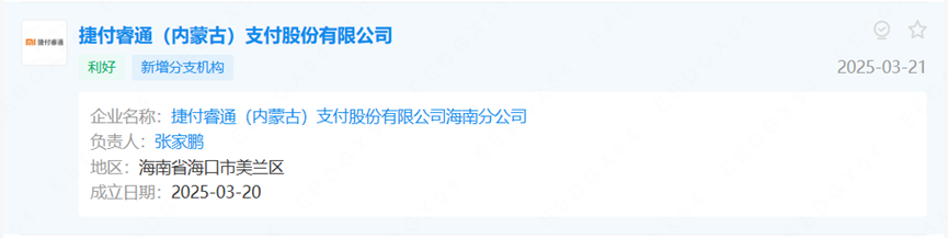 文章來源:四九八網絡發布時間:2025-03-27 09:07:02熱度:386近日,捷付睿通(內蒙古)支付股份有限公司(簡稱“捷付睿通”)近日再新增一家分支機構——捷付睿通海南分公司。該分支機構成立于2025年3月20日,負責人為張家鵬。