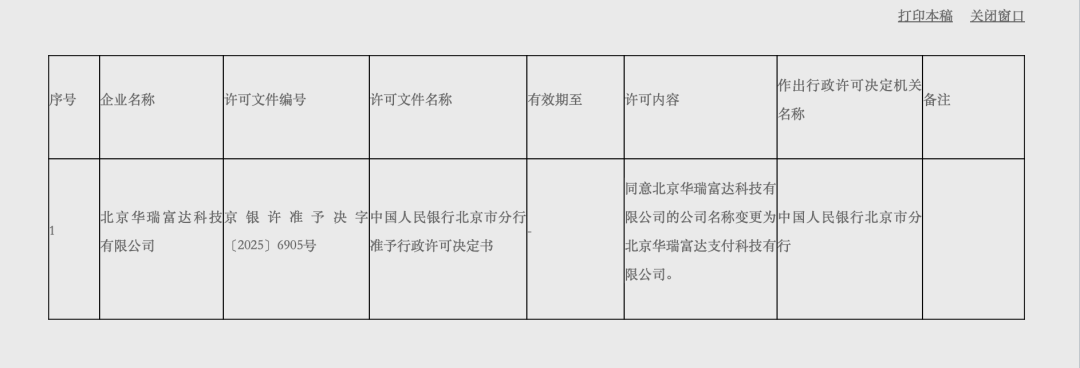 北京華瑞富達支付成立于2007年,于2012年獲得由中國人民銀行頒發的《支付業務許可證》,并于2022年6月續展成功,業務類型儲值賬戶運營Ⅱ類(預付卡發行與受理),業務范圍北京市。