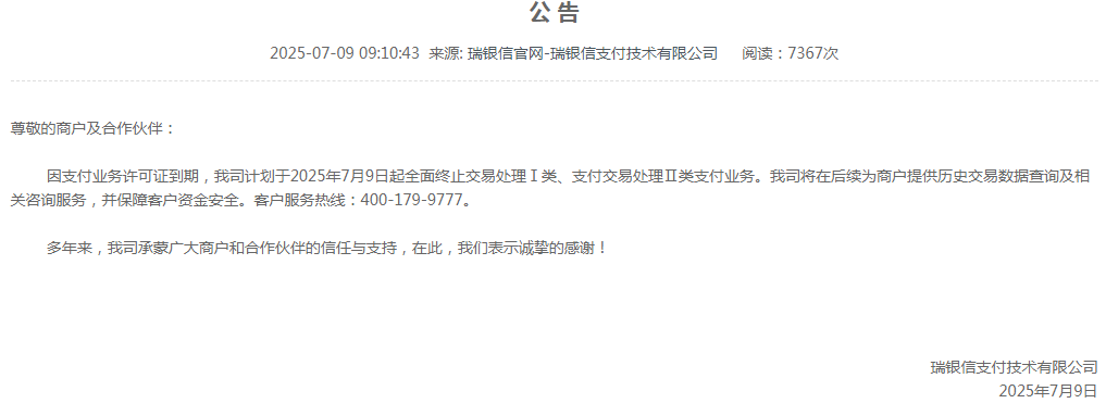 文章來源:四九八網絡發布時間:2025-07-17 09:24:27熱度:2817月9日,瑞銀信支付技術有限公司(下稱“瑞銀信”)發布公告,因支付業務許可證到期,我司計劃于2025年7月9日起全面終止交易處理Ⅰ類、支付交易處理Ⅱ類支付業務。我司將在后續為商戶提供歷史交易數據查詢及相關咨詢服務,并保障客戶資金安全。