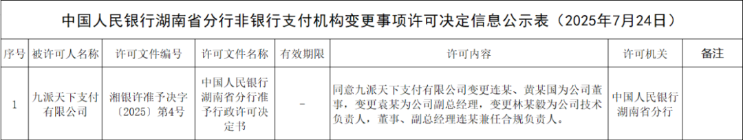 文章來源:四九八網絡發布時間:2025-08-11 09:22:39熱度:199中國人民銀行湖南省分行非銀行支付機構變更事項許可決定信息公示表(2025年7月24日)顯示,中國人民銀行湖南省分行同意九派天下支付有限公司(下稱“九派支付”)變更連某、黃某國為公司董事,變更袁某為公司副總經理,變更林某毅為公司技術負責人,董事、副總經理連某兼任合規負責人。