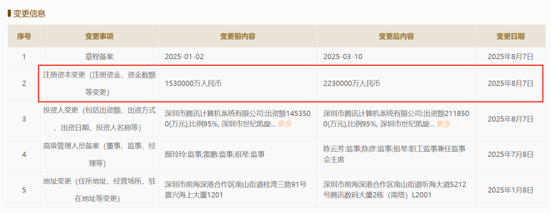 文章來源:四九八網絡發布時間:2025-08-12 09:09:33熱度:238據國家企業信用信息公示系統顯示,財付通支付科技有限公司于2025年8月7日完成注冊資本變更,從153億元增至223億元,增幅達45.75%。