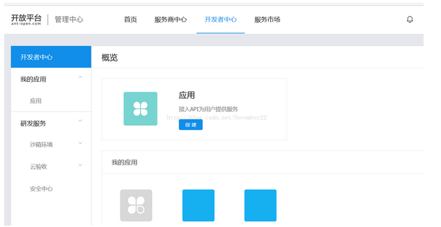 第一步驟:登陸螞蟻金服開放平臺,這里建議使用公司的企業賬戶登陸。登陸完,登陸完界面如下: